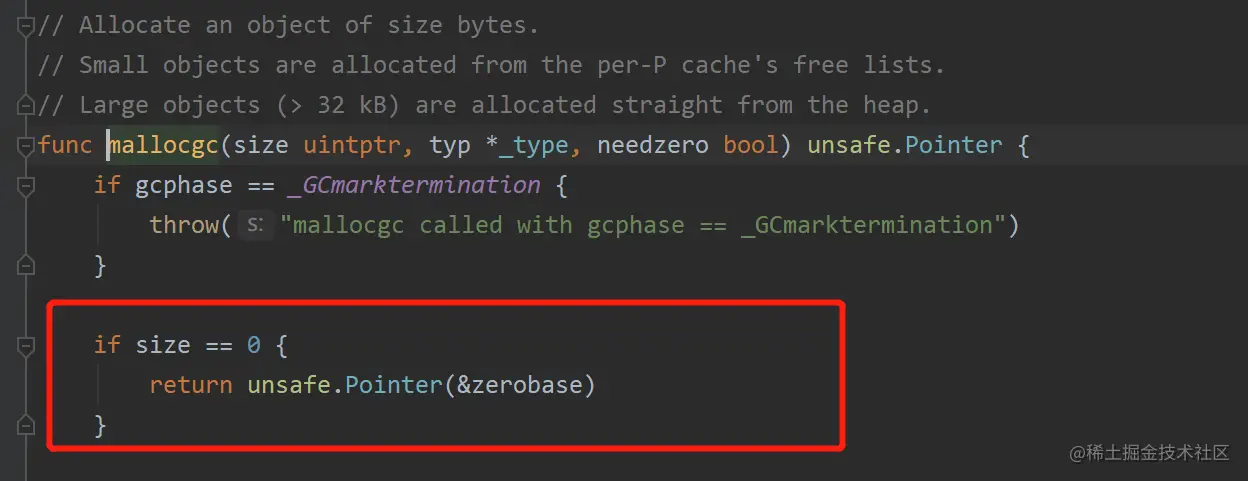 如果 size 为 0 的时候,统一返回的都是全局变量 zerobase 的地址。【PS:正常struct是占用一小块内存的,并且结构体的大小是要经过边界,长度的对齐的,但是“空结构体”是不占内存的,size为0】。总结原因: