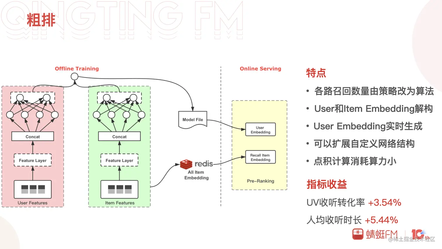 双塔模型扩展性好便于自由添加自定义的网络,User和Item塔解偶,同时点积的计算所需算力小。在蜻蜓为了保障粗排推理数据的实时性,User向量的生成及点积的计算都是实时的。粗排的加入在数据指标指标上也获得了不错的收益,其中信息流UV收听转化率增加了3.54%,人均收听时长增加了5.44%。