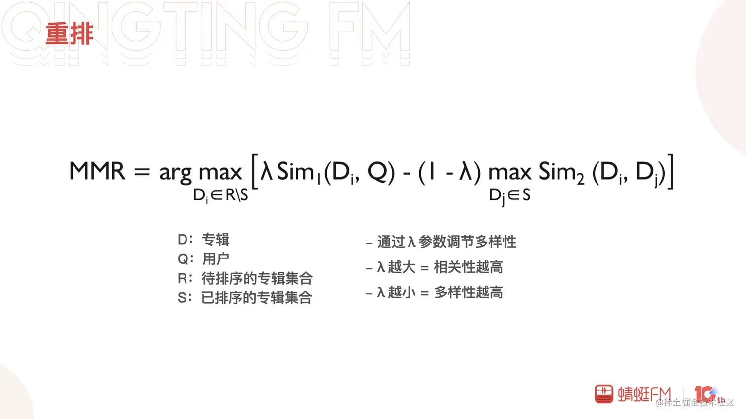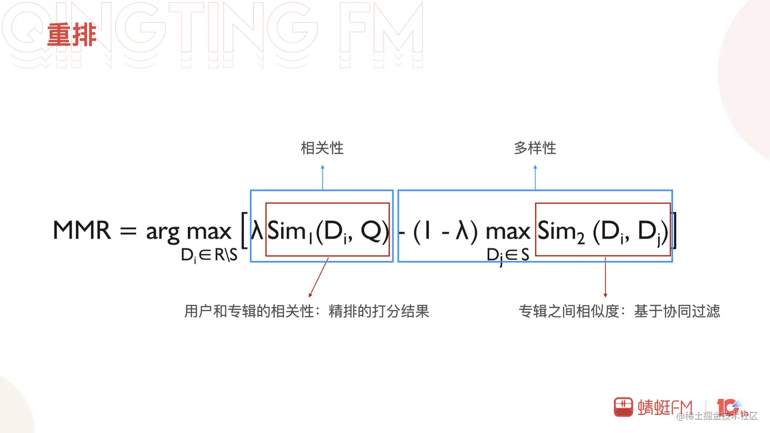 最后是重排,重排跟召回一样承载了很多业务向的目标和期许。这里主要讲一下多样性,提升多样性一方面希望打破推荐系统的信息茧房,另一方面也希望提升用户的长期使用体验。开始是通过打散策略实现,当前主要是MMR和DPP两个算法在尝试迭代,实验中MMR表现优于DPP,这里简单介绍一下。MMR(Maximal Marginal Relevance)最大边际相关性算法,保证相关性的同时提高多样性。通过λ参数来调节多样性和相关性的权重,λ越大相关性越高,λ越小则多样性越高。
