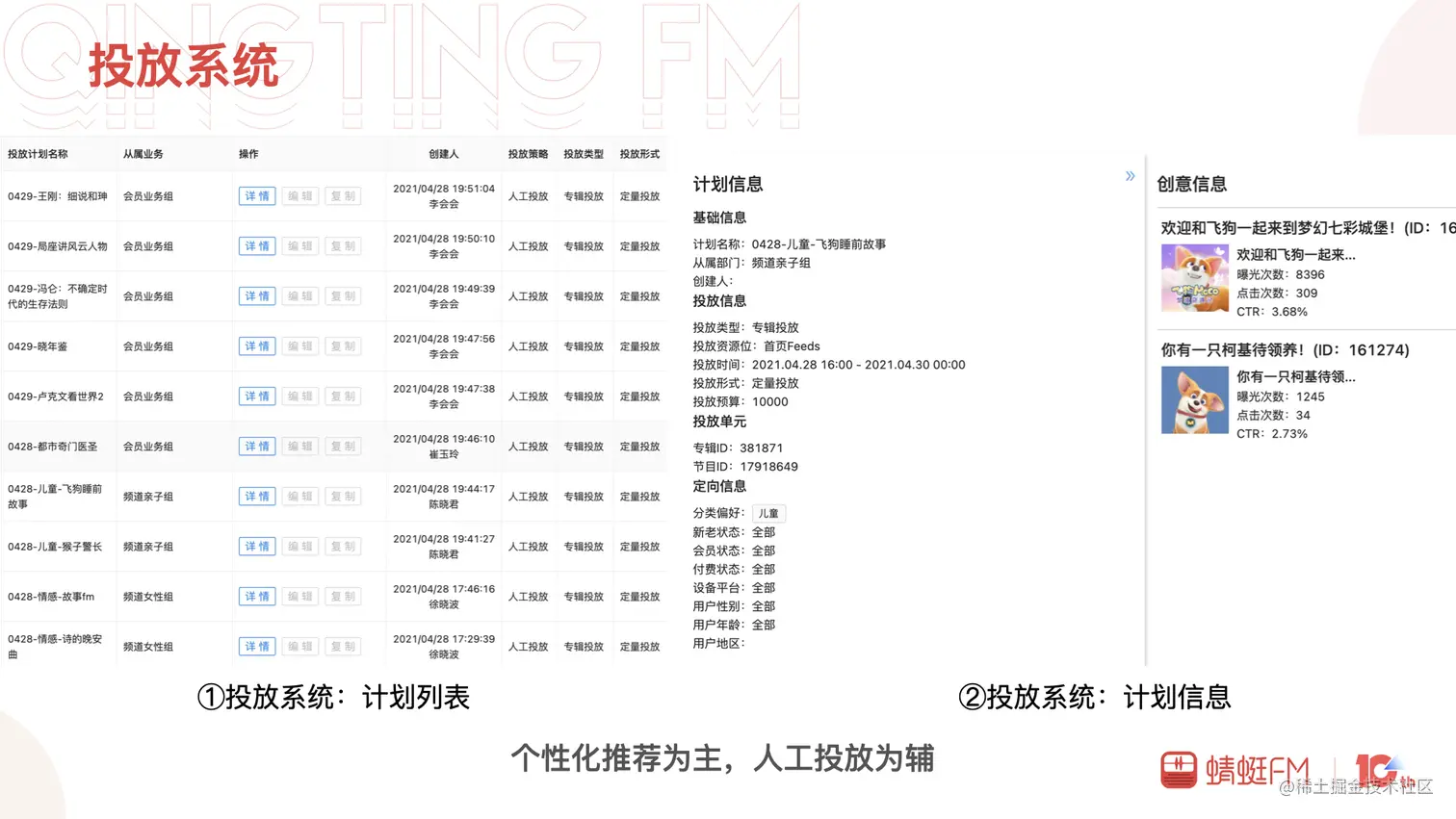 个性推荐时期运营对于少数专辑依然会有流量扶持、推广的的述求,在个性化推荐的基础上增加了投放系统。投放系统中还支持通过不同标题、封面对单个投放计划生成多个创意,多个创意之间数据表现好的沉淀下来推广到更多的场景中。运营不再局限于选择内容,更为重要的是重新组织创造了内容,充分发挥出了运营在想象力、创造力上的价值。