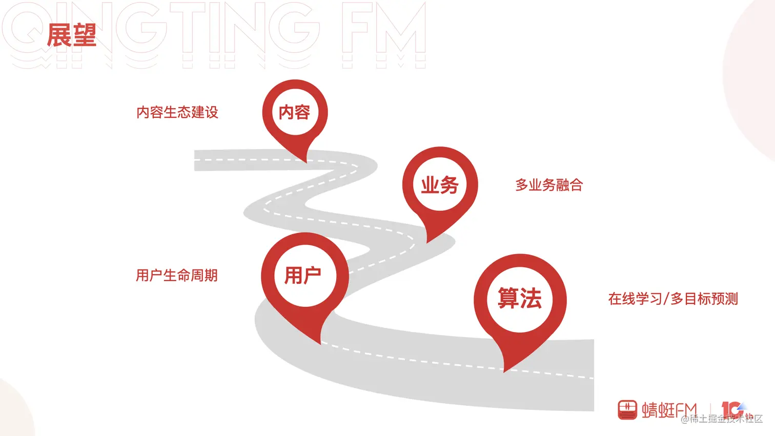 首页信息流推荐从0到1建立起来,迭代、优化、完善到现在取得了不错的增长,面向未来还有许多工作需要我们去尝试和探索。内容方面,如何帮助新品内容一步一步变成曝款,产品、研发、运营如何合作建立出完善的内容生态系统;业务方面,信息流支持的业务越来越多包括专辑、直播、听单、节目、广播等,多业务如何更好的融合在一起也是一个挑战; 用户方面,新用户的冷启动,沉默用户、潜在流失用户如何激活还有很长的路要走;算法方面,模型的训练如何做到更加实时,多目标的排序是否有望代替单目标排序。这些都将是我们接下来探索的方向。