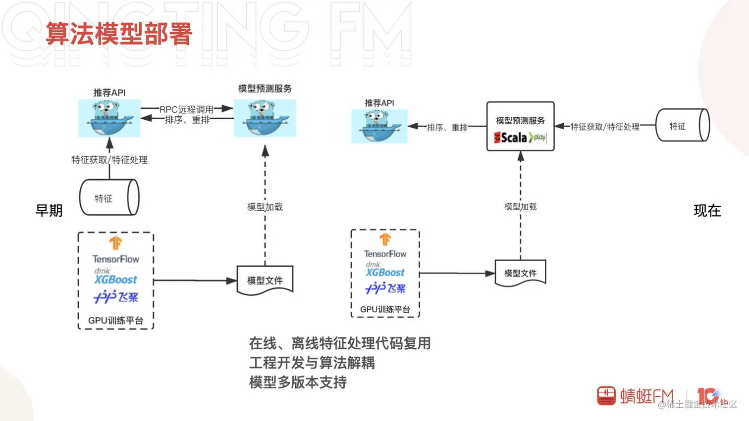 算法模型如何高效地部署到线上?是算法和工程同学共同面临的挑战。开始的时候我们的模型预测服务和推荐API都是用Golang实现,特征的获取处理在推荐API测完成,模型预测服务负责加载模型并对对获取的数据进行预测。在线特征拼接处理使用Golang,离线特征拼接处理使用Scala,跨语言的对齐与校验耗费了开发很多的时间。离线和在线能否公用一套算子进行特征的拼接与处理?为此我们将模型预测服务切换成了Scala的Play框架,基于Scala开发出了一个feature获取处理的库,给Spark和Play共同使用,保证了特征处理逻辑层面的一致性。同时,模型预测服务中增加了对多模型、多版本的支持以及模型的自动更新进一步提高了模型部署的效率。