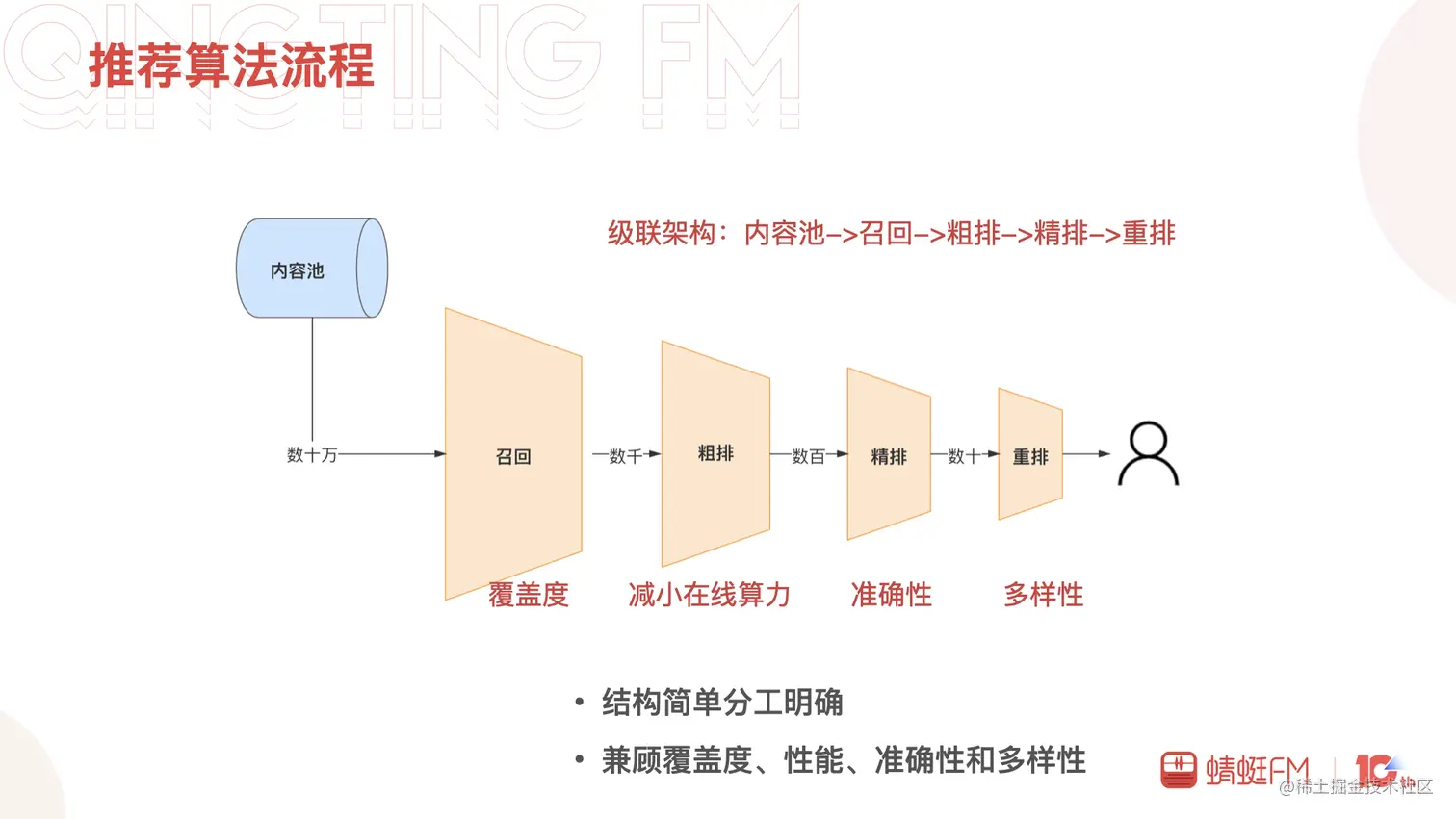 推荐算法的流程大致如下:内容池中达到推荐标准的内容的有几十万个,召回层从中选出用户可能喜欢的几千个进入粗排层,召回层的覆盖度决定了整体推荐内容的覆盖上限。粗排层从召回结果中挑选出几百个给到精排层,粗排层主要为了减小在线算力减轻精排的压力。精排层选几十个给到重排层,精排层专注于推荐的准确性。最后,重排层对推荐结果进行重新排序给到用户,这一层兼顾准确性的同时还需要保证多样性。