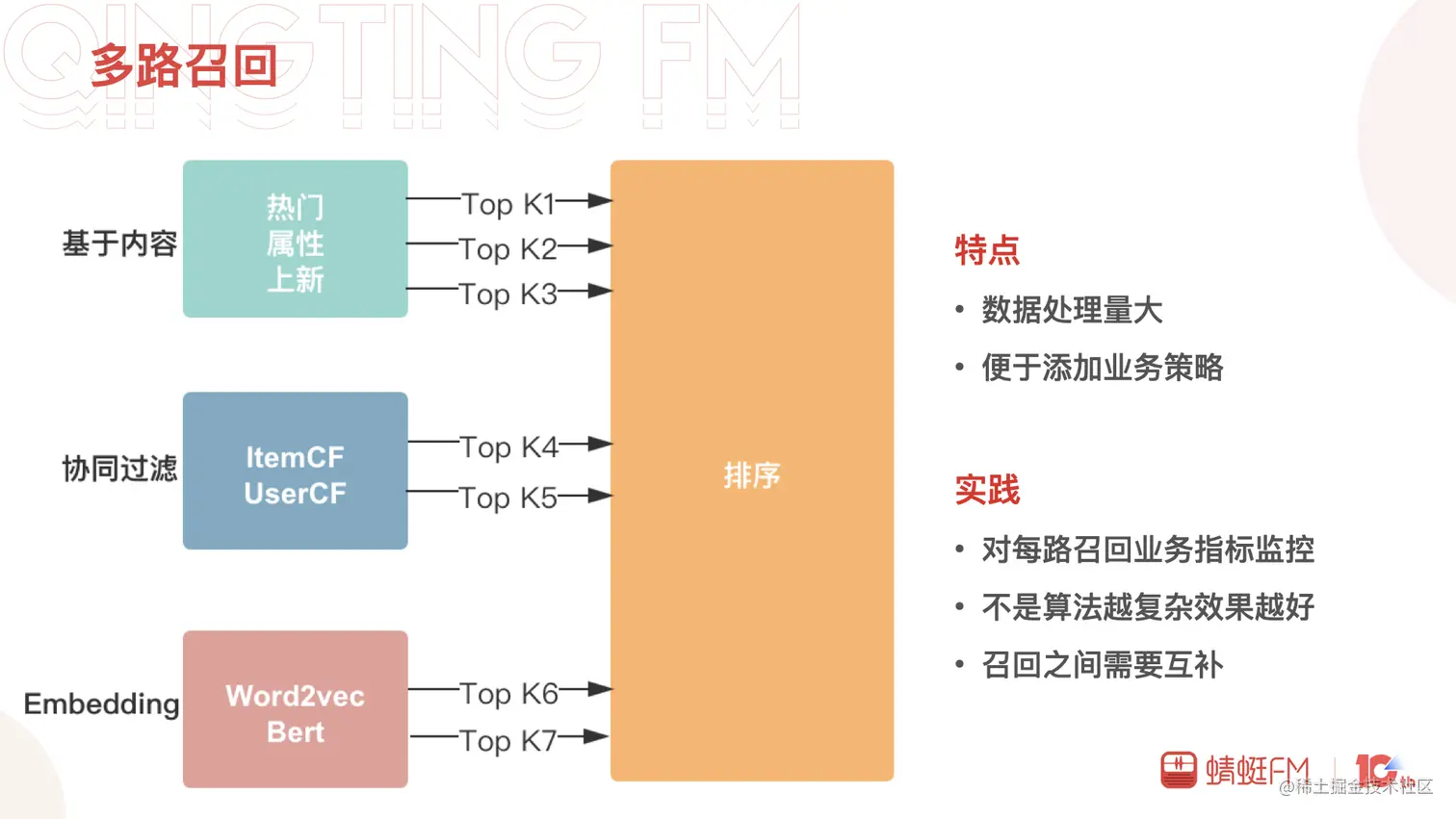 熟悉了推荐的算法的大致流程后,首先,我们来了解一下多路召回。多路召回在蜻蜓主要分为三类:基于内容、协同过滤和Embedding向量召回。基于内容的召回包括热门、属性、上新策略的召回;协同过滤包括User Based和Item Based;Embedding向量召回有Word2vec和Bert。召回环节处理的数据量大,复杂度不能太高,多路召回的设计可以方便加入新的策略或者算法。我们在实践中发现,早期建立完善指标,追踪每路召回的效果,有助优胜劣汰;召回的效果并不是召回算法越复杂越好,不同的业务特点不一样适合的召回也可能不一样,比如蜻蜓当下表现最优的召回来自ItemCF和热门;随着召回的算法越加越多,新的召回需要与现有召回有差异性、互补才会有存在的价值。召回环节还会承载业务及平台建设的使命比如用户和物品的冷启动、业务流量扶持等,召回环节的好坏直接决定了后续环节的上限。