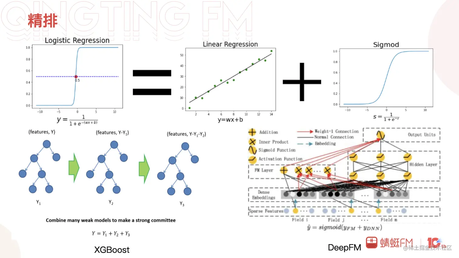 然后是精排,精排往往在推荐系统中最受关注,精排直接对准确性负责,相对容易拿到直接的收益。我们在精排的投入相对较大,从中获得的收益也相对颇多。蜻蜓的精排经历了三个阶段:线性模型的逻辑回归和FM、树模型的XGBoost以及神经网络模型的DeepFM。
