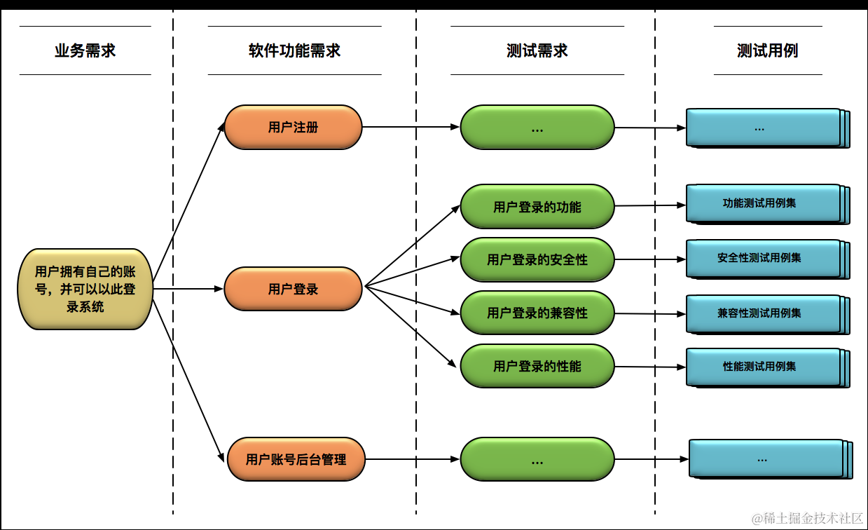 - 从软件功能需求出发,全面地、无遗漏地识别出测试需求是至关重要的,这将直接关系到用例的测试覆盖率。 比如,如果你没有识别出用户登录功能的安全性测试需求,那么后续设计的测试用例就完全不会涉及安全性,最终造成重要测试漏洞。