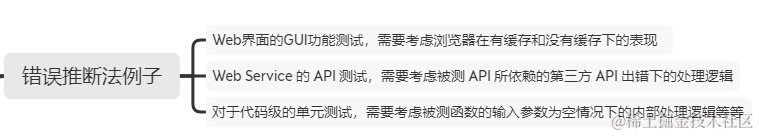 - 错误推断法:基于对被测试软件系统设计的理解、过往经验以及个人直觉,推测出软件可能存在的缺陷,从而有针对性地设计测试用例方法。强调的是对被测软件的需求理解以及设计实现的细节把握