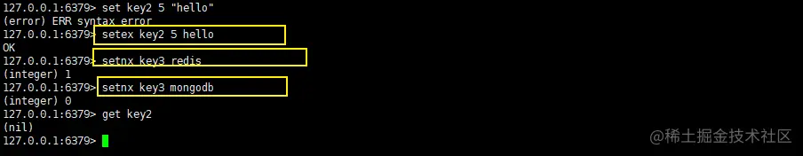 setnx key3 "redis":在指定的key不存在时,为key设置指定的值,这种情况下等同于set,当key存在时,什么也不做。返回值:0 被设置了 1 没有被设置。
