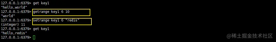 getrange key2 m n:获取[m,n]区间范围内的字符串。n可以为负数,表示偏移,-1 表示最后一个字符, -2 表示倒数第二个字符,以此类推。 -