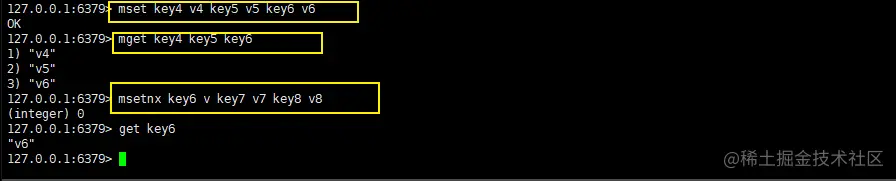mset key1 value1 key2 value2 ......keyn valuen:设置多个key和value,如果这其中已经存在key,则会覆盖掉。mget key1 key2 ...keyn:返回所有给定的key的值msetnx key1 value1 key2 value2 ...keyn valuen:设置多个 key value,当且仅当所有给定的健都不存在时,即使有一个健存在值,msetnx也会拒绝执行操作。