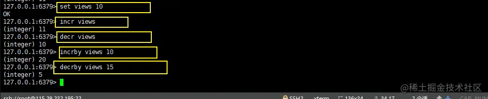 set views 0:要设置为数字才能用incr,decr命令 ,本质上这是一个字符串操作,因为Redis没有专门的整数类型。存储在 key 中的字符串被转换为十进制有符号整数incr views:执行一次就将key中存储 的数字值增一decr views:执行一次就将key中存储的数字值减一incrby views 10:执行一次key中存储的值+10decrby views 10:执行一次key中存储的值-10