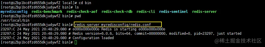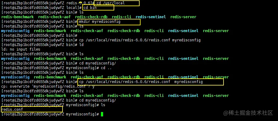 - 进入/usr/local/bin目录,这是redis的默认安装目录。在这个目录创建一个myredisconfig的文件夹。然后将/usr/local/redis/redis-6.0.6下的redis.conf拷贝到这个文件夹下