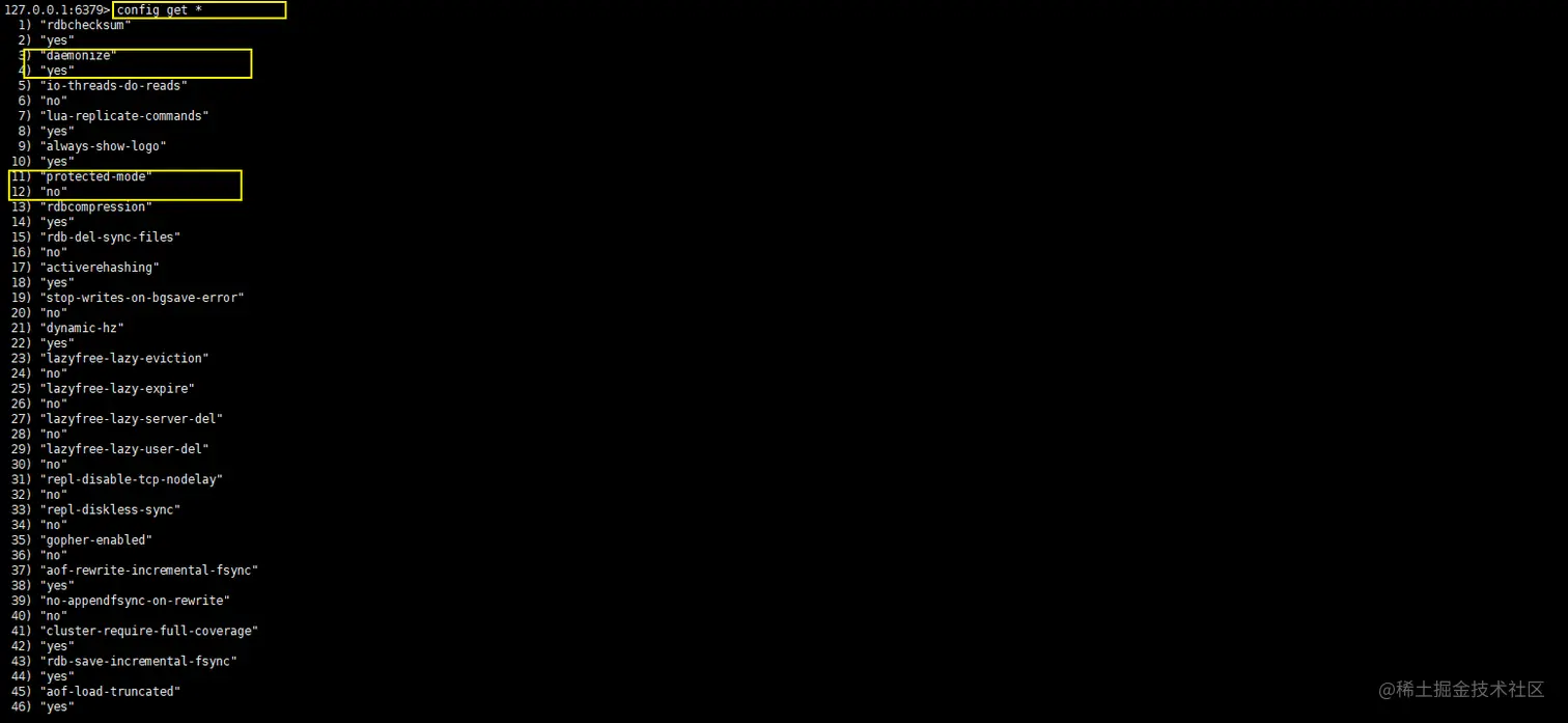 在redis中查看基本的配置 config get *:获取全部的配置,可以查看配置是否修改成功。