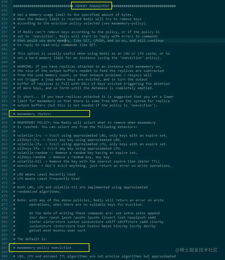 memory management 内存管理 maxmemory :redis配置的最大内存容量 maxmemory-policy noeviction:maxmemory-policy 内存达到上限的处理策略 volatile-lru:利用LRU算法移除设置过过期时间的key。 volatile-random:随机移除设置过过期时间的key。 volatile-ttl:移除即将过期的key,根据最近过期时间来删除(辅以TTL) allkeys-lru:利用LRU算法移除任何key。 allkeys-random:随机移除任何key。 noeviction:不移除任何key,只是返回一个写错误