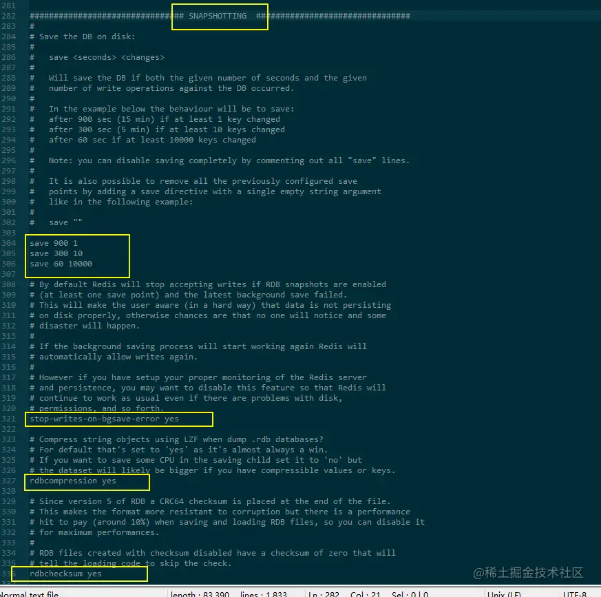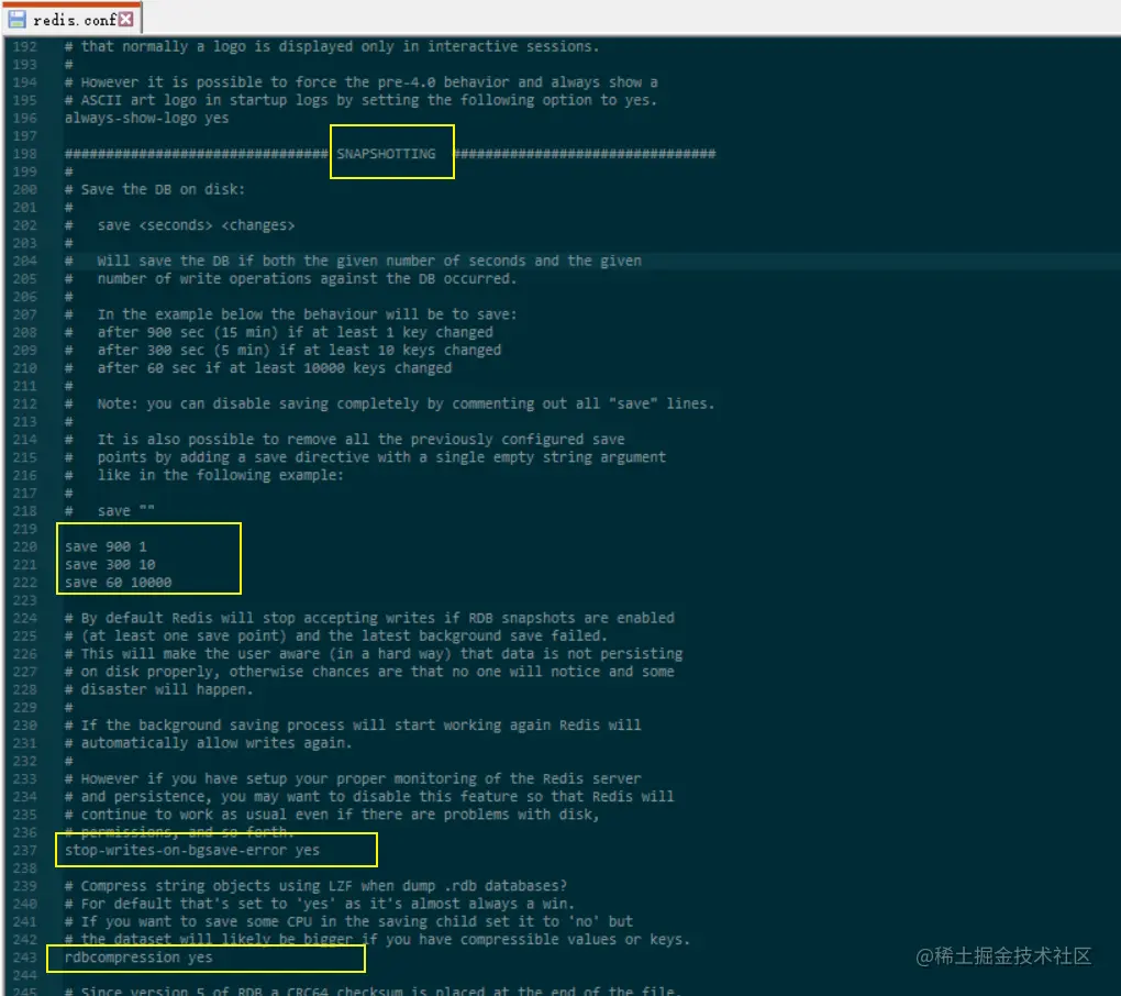 除了通过客户端发送命令外,还有一种方式,就是在redis.conf配置文件中SNAPSHOTTING下的save来指定触发持久化的条件。