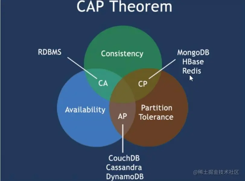 - CAP理论的核心是一个分布式系统不可能同时很好的满足一致性,可用性和分区容错性这三个需求, 最多只能同时较好的满足两个。因此,根据 CAP 原理将 NoSQL 数据库分成了满足 CA 原则、满足 CP 原则和满足 AP 原则三 大类: