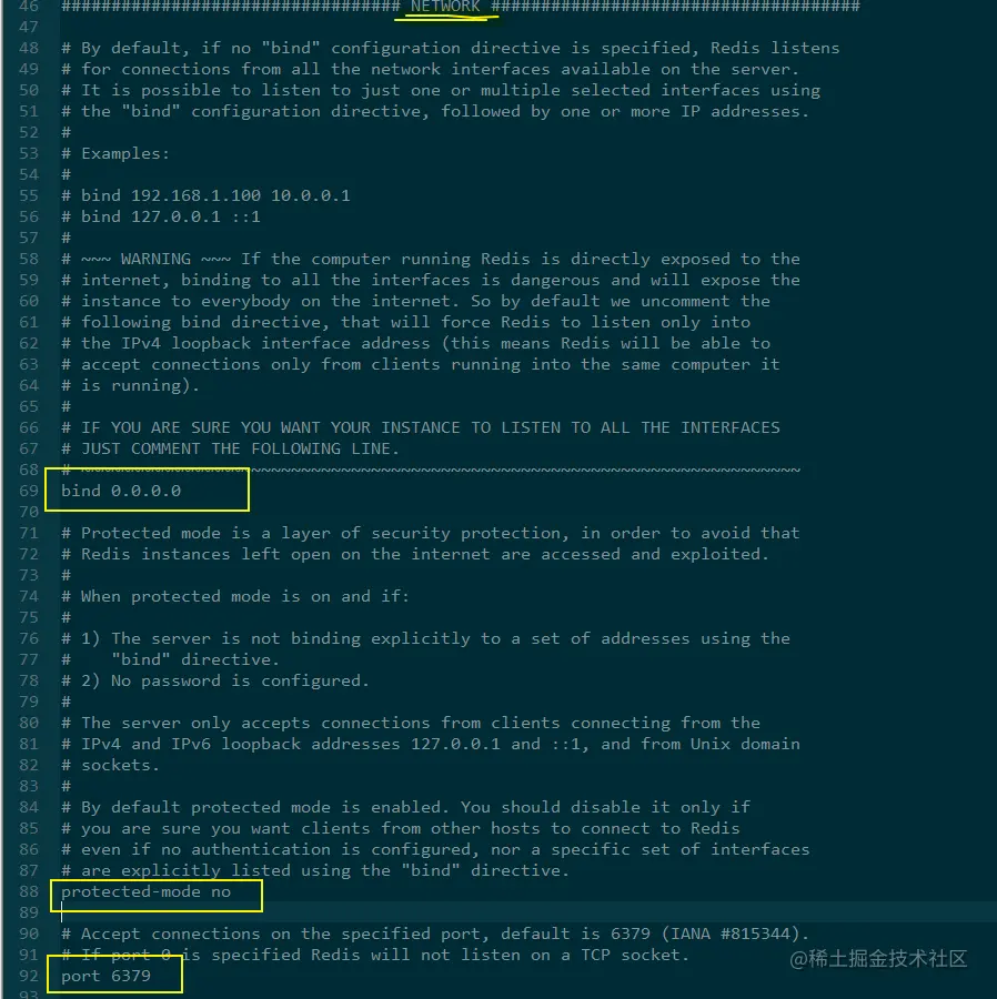network网络配置 bind 0.0.0.0 :绑定的主机地址 protected-mode no:保护模式,默认为yes, 默认是开启,开启后Redis只会本地进行访问,拒绝外部访问.需要设置为yes port 6379 :默认端口