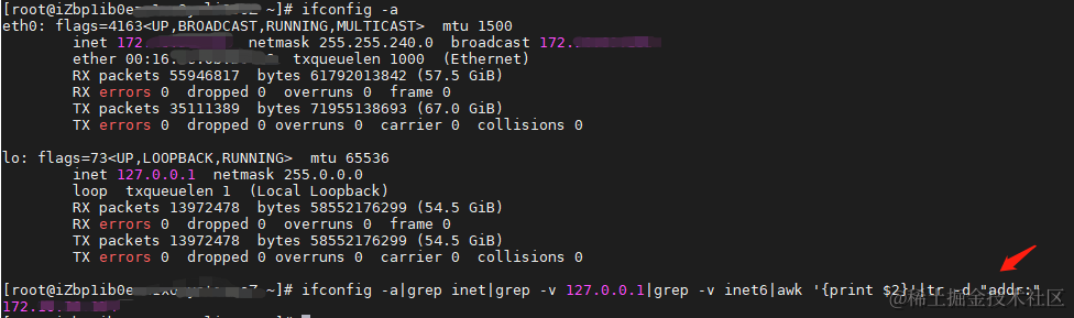 2 ip=`ifconfig -a|grep inet|grep -v 127.0.0.1|grep -v inet6|awk '{print $2}'|tr -d "addr:"`