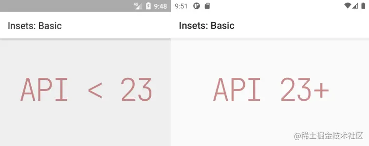 该库在 Android 平台上使用时,可自动处理 API 版本差异。比如,Android 原生从 API 23 才开始支持状态栏深色图标,那么针对低版本设备,该库通过使用 Scrim 自动调整状态栏颜色以此来保持状态栏整体的对比度: