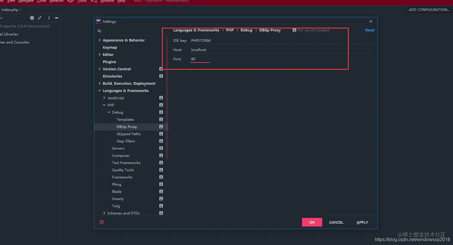 打开File--->Settings--->Languages & Frameworks(语言与框架中)--->PHP---->Debug---->DBGp Proxy