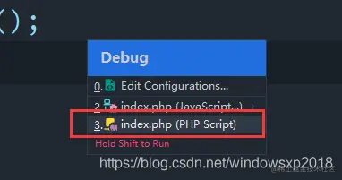 然后选择Run菜单选项----->Debug, 在弹出对话框中选择index.php(PHP Script)