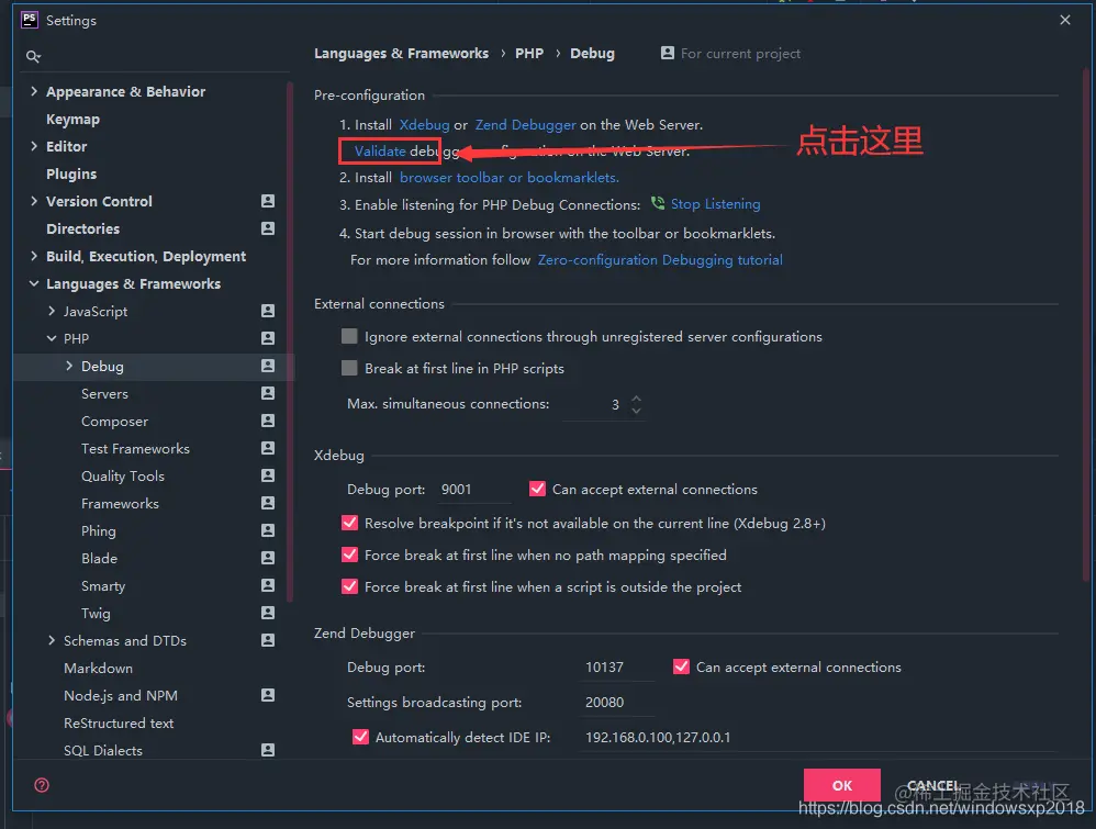 启动phpStorm随后在打开File--->Settings--->Languages & Frameworks(语言与框架中)--->PHP---->Debug在显示的面板中设置端口,端口默认为9000,我们在php.ini中配置的多少这里就设置是多少!