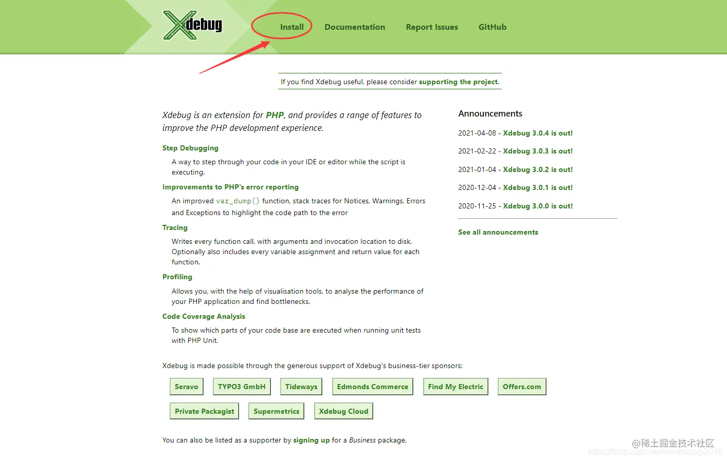 打开官方地址:https://xdebug.org/ , 点击Install菜单选项