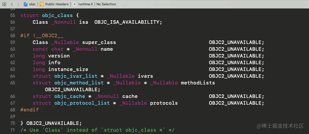 我们在上文说到,类也是存在内存结构的;我们知道对象的内存空间放的是一个个的成员变量,那么类的内存结构里存放的是什么东西呢?接下来我们来研究一下;我们在之前的文章中已经确定了,类在底层一个objc_class的结构体,那么我们在objc的源码中搜索objc_class的定义发现有两处: