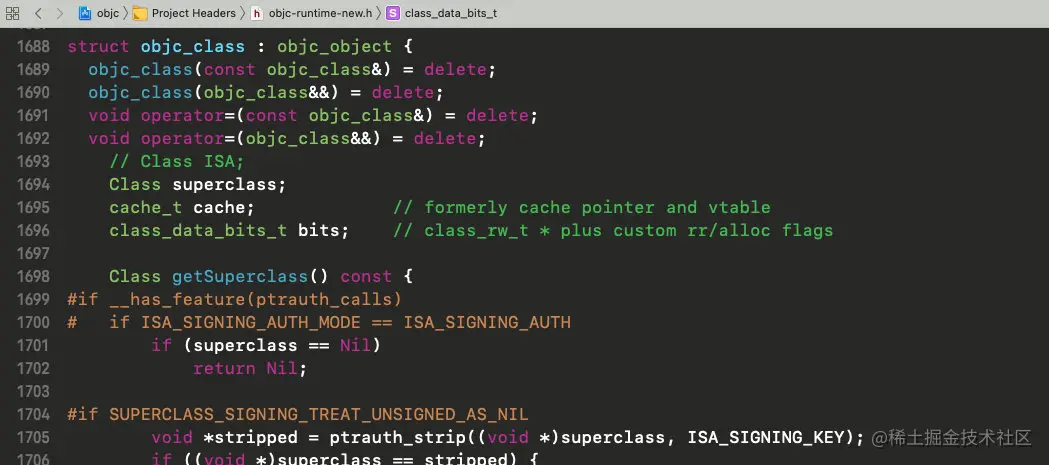 Class ISA来自于上层的objc_objectClass superclass是父类cache_t cache是什么我们不知道class_data_bits_t bits我们看到bits.data()返回了一个class_rw_t类型的数据,而进入class_tw_t发现里边有methods()、properties()、protocols()等数据,那么我们来着重研究一下这个数据