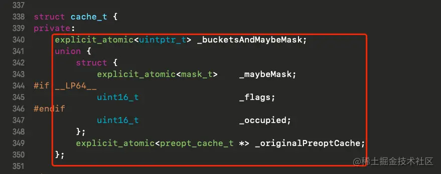 我们在前边的文章已经确定了,成员变量是影响内存的因素,static修饰的存在在全局区,也不占用结构体内存,那么最终影响cache_t占用内存大小的主要因素为: