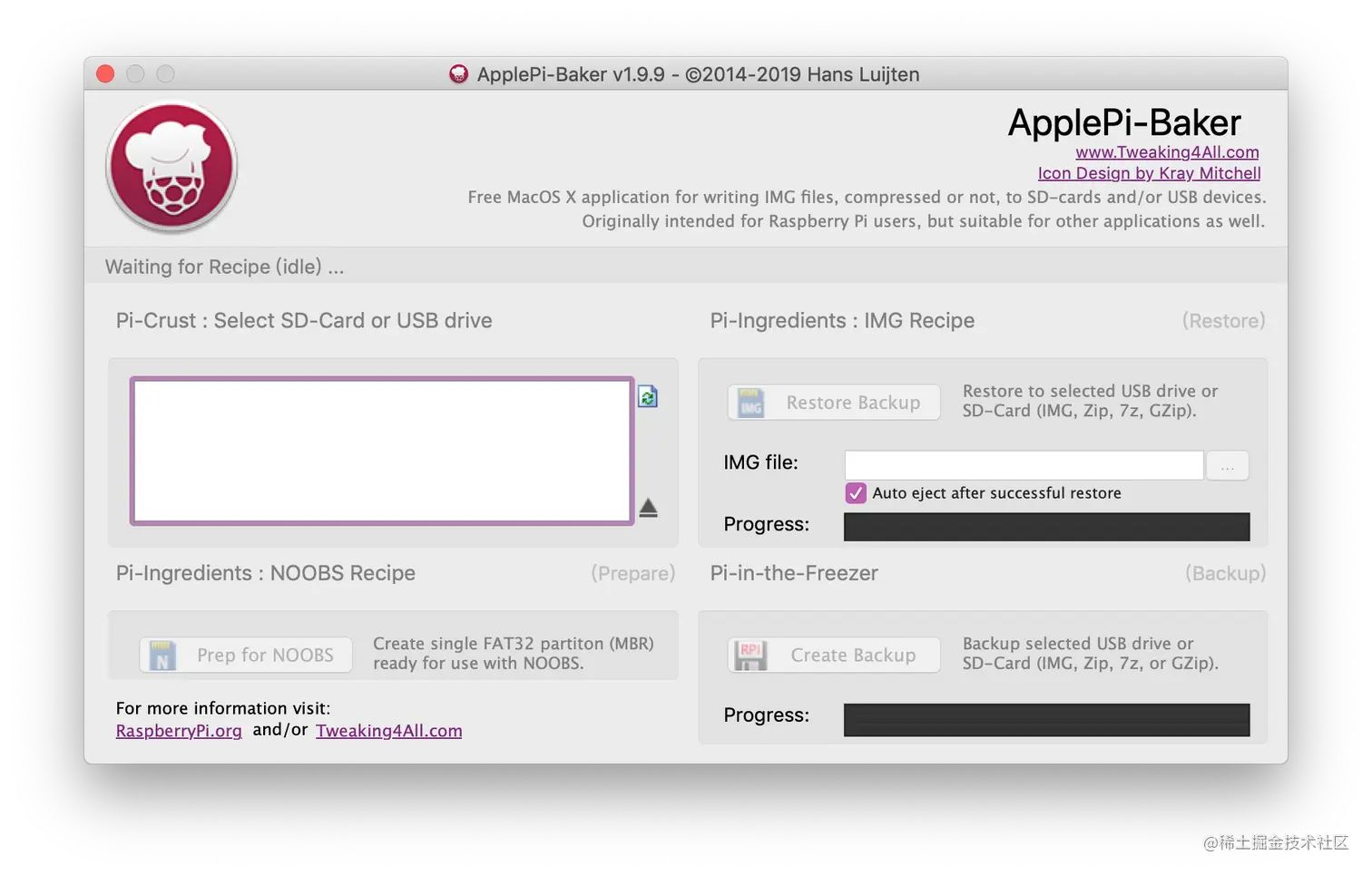 选中 ApplePi Baker 左上角的方块列表中的磁盘,右侧选择刚刚下载的zip解压得到的img镜像,点Restore Backup即可