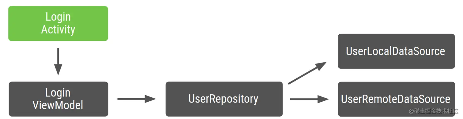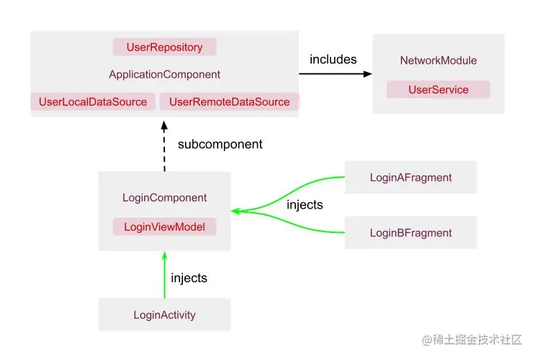 注意,这里 ApplicationComponent 之前的 inject 方法删除了,因为 inject 放到了专门的登陆子组件中。增加了一个返回 UserRepository 实例的 repository() 方法,如果不加这个方法且 UserRepository 没有跟 ApplicationComponent 一样用 Singleton 注解标识的话,UserRepository 就会被包含到 LoginComponent 依赖图中,因为它被 LoginViewModel 引用了,这是目前使用它的唯一位置,而 LoginViewModel 是 LoginComponent 子组件中的依赖。现在的依赖关系如下图:
