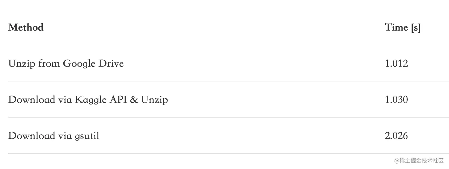 从Google 硬盘压缩需要很长的时间,这种方法是真的比直接通过 Kaggle API 或者 gsutil 下载要更快吗?为了回答这个问题,我准备了房价预测竞赛(www.kaggle.com/c/house-pri… 935KB,并测试这 3 种方法的解压缩时间,结果如下所示: