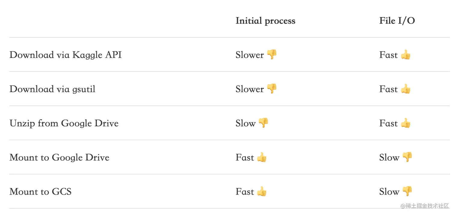 Colab Pro可以满足 Kaggle 竞赛中大部分比赛的资源要求。但是这里存在一个问题,每个会话只能保持 24 小时。每次都需要准备数据集,根据准备的方式,这需要一些时间。在下面的表格中,从初始化加载和磁盘读写的时间来对比 5 种准备 Kaggle 数据集的方法:
