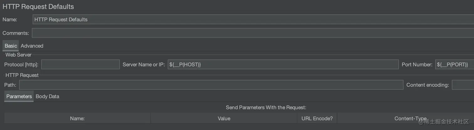 - 右键单击 Test Plan 下新增的 Thread Group,把鼠标移至 Add,再移至 Config Element,点击 HTTP Request Default,设置 Server Name or IP 为
