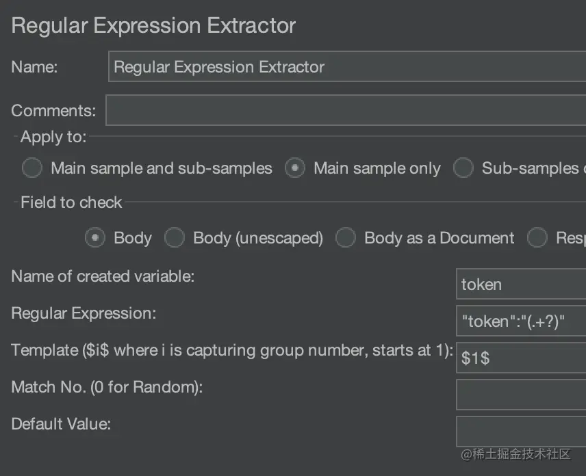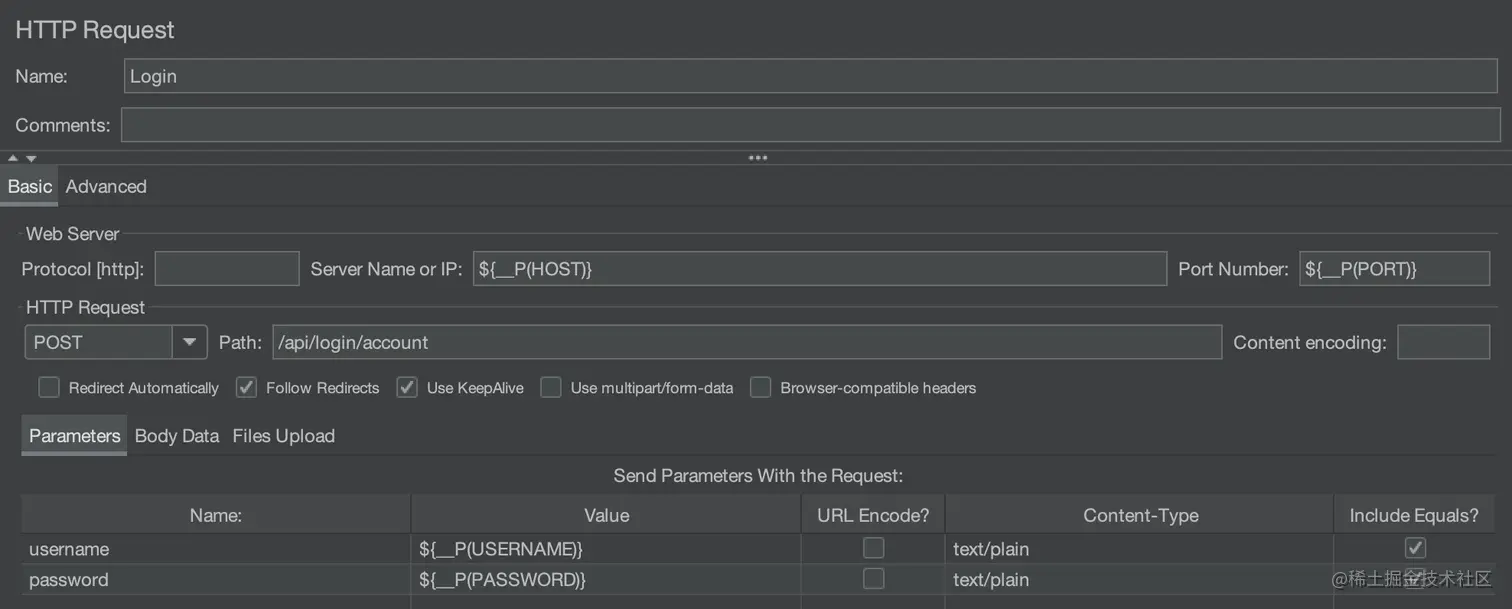 ${__P(HOST)},Port Number 为${__P(PORT)},HTTP Request 的方法为 POST,Path 为 /api/login/account,点击 下方的 Add,分别增加 Name 为 username 和 password,Value 为${__P(USERNAME)}和${__P(PASSWORD)} - 右键单击 setUp Thread Group,把鼠标移至 Add,再移至 Post Processors,点击 Regular Expression Extractor,设置 Name of created variable 为 token,Regular Expression 为