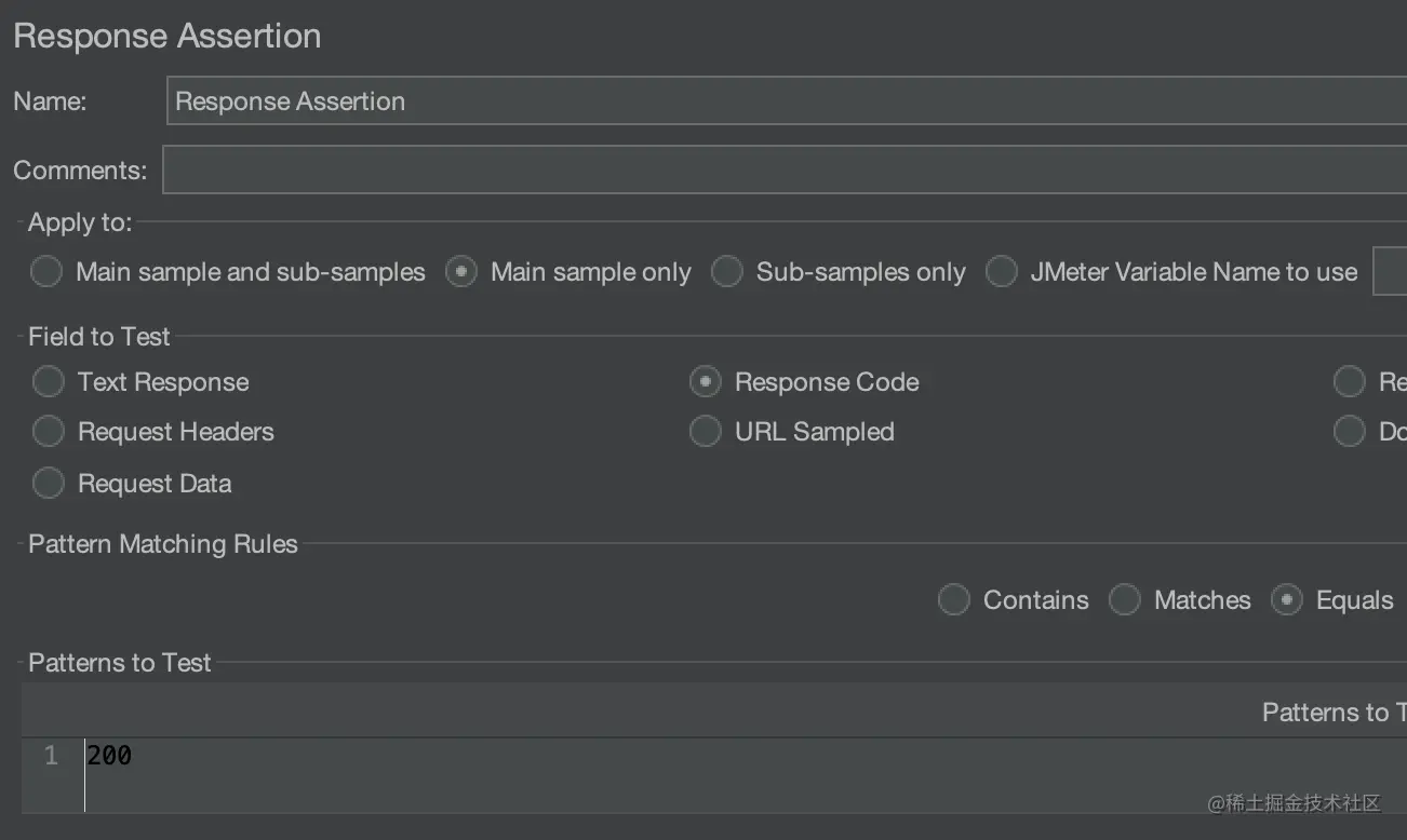 - 右键单击 Thread Group,把鼠标移至 Add,再移至 Assertion,点击 Response Assertion,设置 Field to Test 为 Response Code,Patten Matching Rules 为 Equals,点击下方的 Add,输入 200