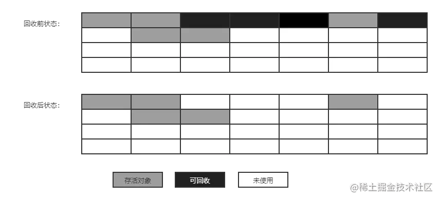 标记-清除算法是最早出现的垃圾收集算法,见名知意,算法分为“标记”和“清除”两个阶段:首先标记出所有需要回收的对象,标记完成后,统一回收掉所有被标记的对象,也可以反过来,标记存活对象后回收所有未标记对象。