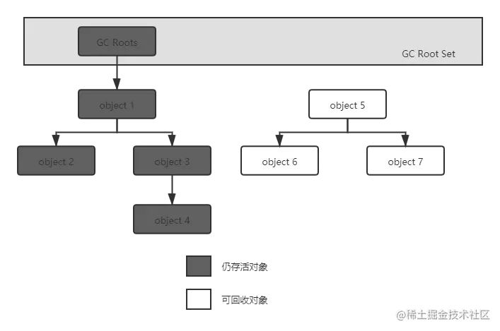 可达性分析算法的基本思路如上图,通过一系列成为“GC Roots”的根对象作为起始节点集,从这些节点开始,根据引用关系向下搜索,搜索过程中所走过的路径成为“引用链”,如果某个对象到GC Roots间没有任何引用链相连接,则证明此对象是不可能再被使用的。