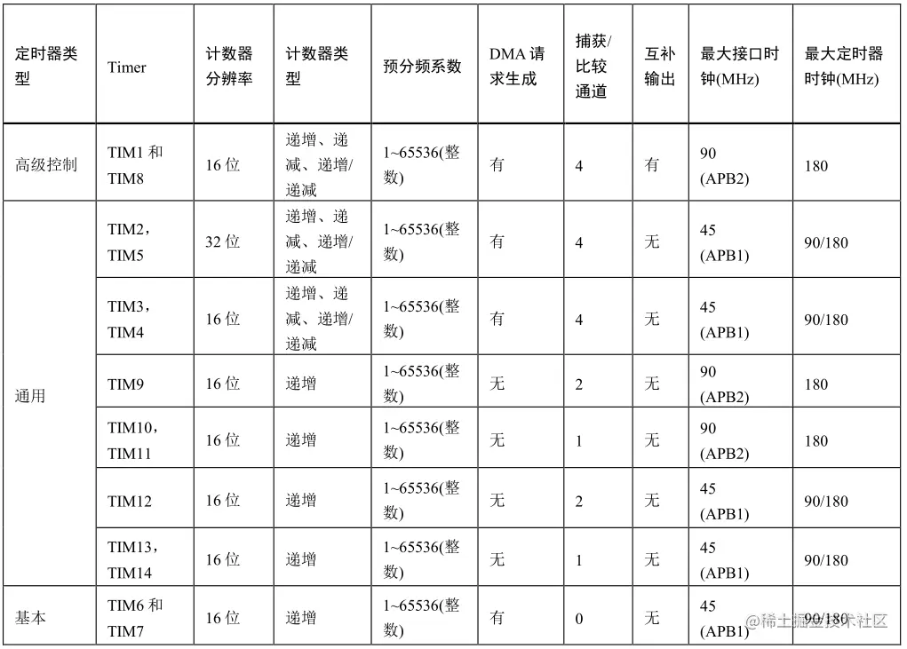 比如说你现在要使用一个定时器,那么先要决定你要用哪一个定时器,是高级定时器还是通用定时器呢?假如你要用高级定时器(TIM1 、TIM8),那他和通用定时器有啥区别呢?在程序中我们如何来体现他们的区别呢?第二个你要关心的就是你使用的定时器是多少位的,一般有16位和32位区分。比如TIM1就是16位,那么他的最大计数个数就是2^16=65536-1, 也就是说你的TIM_TimeBaseStructure.TIM_Period = X ;其中X最大值为65535,你不能高于它。但是如果你使用TIM2就是32位,那么他的最大计数个数就是2^32=4294967296-1,也就是说你的TIM_TimeBaseStructure.TIM_Period = X ;其中X最大值为4294967295,你不能高于它。 第三就是你要清楚你使用的这个定时器的时钟来源是哪里,一般来说我们高级定时器(TIM1、TIM8)的时钟来源是来自AHB2,你可以这样记:高级定时器的时钟频率肯定高于通用定时器的时钟频率对吧,又因为2>1,所以高级定时器的时钟来源是来自AHB2对吧,那么通用定时器的时钟源就来自AHB1了对吧。