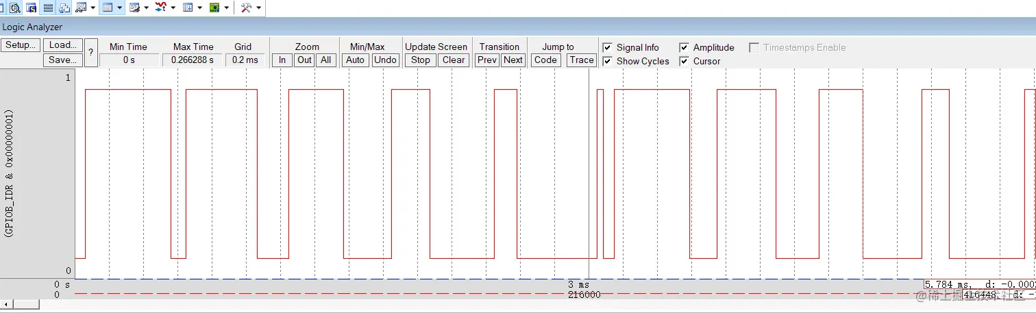 根据而上一章讲到的方法keil中调试一下,可以清楚地看到周期是0.5ms,跟我们上面设置的一样。占空比也是50%,就是1/2。