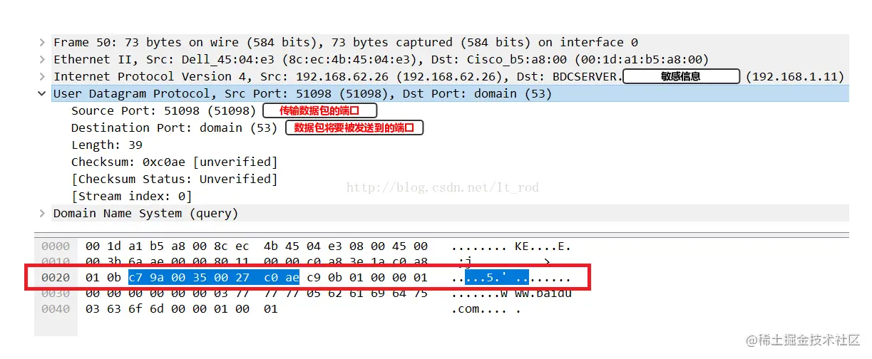 首先查看上面共红色框中的第一条请求,是查询DNS的请求