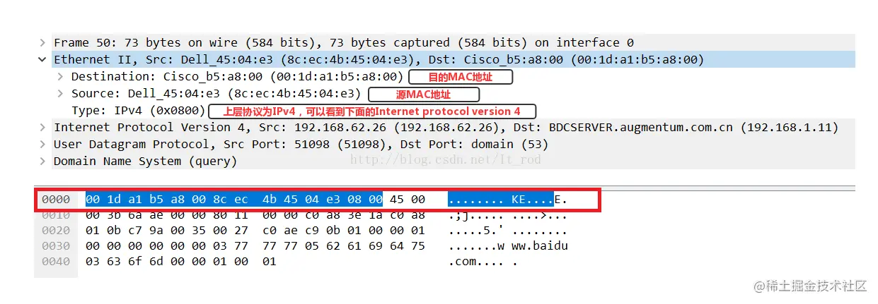 以太网是当今现有局域网采用的最通用的通信协议标准。该标准定义了在局域网中采用的电缆类型和信号处理方法。这里对应的是物理层和数据链路层。如果观察仔细的话可以查看上图OSI七层图解。可以看到最下面物理层的第二条线就是以太网帧,可以看到,这条线直达到IP。这里可以看到对应的以太网首部(以太网中MAC地址,也称物理地址)的信息,而且红色框中表示的是这一层的头部包装的是mac地址的信息。这样和我们之前说的TCP通信传输流对应上了。