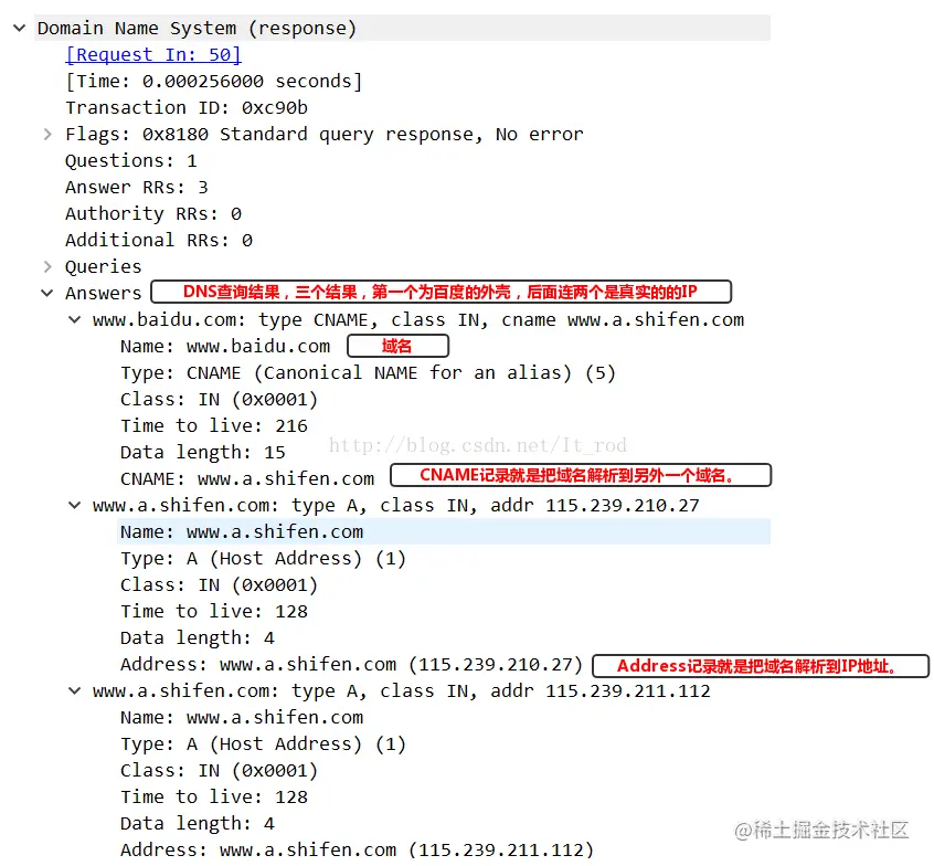 现在我们看一下第二条数据,也就是DNS查询之后返回的结果,结果遇上面的分析类似,相关的mac,ip地址调换,因为这是从目的地发送回来的,我们这里只看一下DNS返回的时候情况。从下图中可以看到首相将www,baidu.com解析到www.a.shifen.com,然后在将www.a.shifen.com解析到两个IP地址。