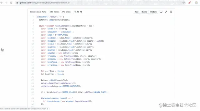 在GitHub边侧栏上显示代码树。非常适合查看项目源代码,无需将代码库clone到编辑器就可以如同在编辑器中操作一样, 可以直接搜索文件跳转。