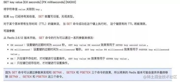 这种情况可以使用Redis事务解决,把setnx与expire两条指令作为一个原子性操作执行,但这样做相对而言会比较麻烦,好在Redis 2.6.12之后版本,Redis set指令支持了nx、ex模式,并支持原子化地设置过期时间: