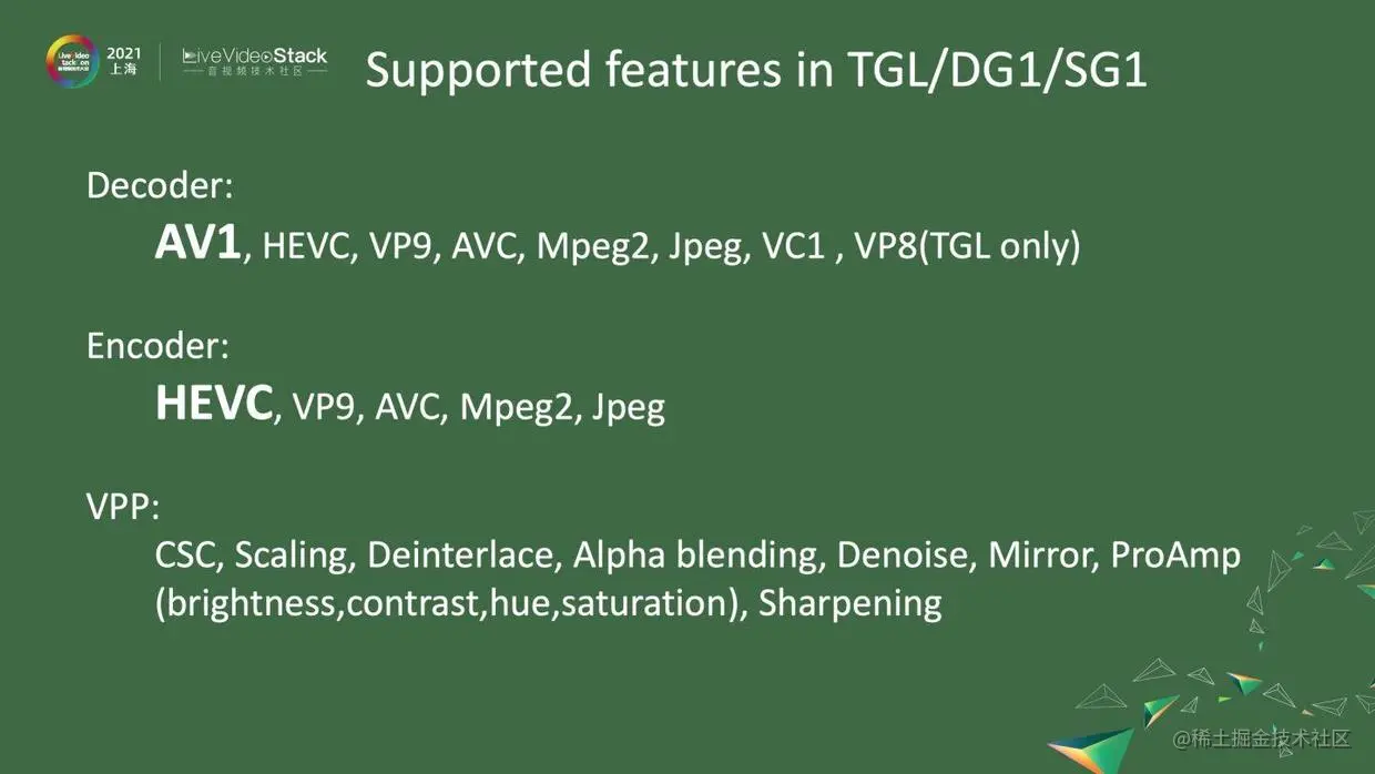 图中就是Tiger Lake、DG1和SG1所有支持的功能。对于基本上市面上能见到的decoder,它们都能支持。对于encoder来说,它们也能支持。特别是针对HEVC,功能比前几代都有很大的提升,后面我会详细介绍。对于VPP来说,它们基本上都能支持。