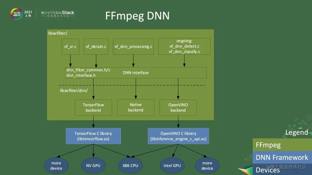 除了传统的FFmpeg encode和decode以外,我们还提供了一些FFmpeg DNN、filter相关的功能。FFmpeg DNN提供了一些基于深度神经网络的功能,可以做到传统filter做不到的事情,比如超分、把雨点去掉、基于DNN的降噪等。我们现在正在做的是基于DNN的detection和分类,以后很多事情都可以在FFmpeg里面完成。所有filter都会调用一个公共的DNN interface,这个interface会被下面三个backend实现。一个是Tensorflow backend,一个是FFmpeg自带的Native backend,还有一个是Intel的OpenVINO backend。不同的backend依赖于不同的外部库。Tensorflow backend依赖于Tensorflow C library,可以调用NVIDIA GPU。OpenVINO backend可以调用Intel GPU等。