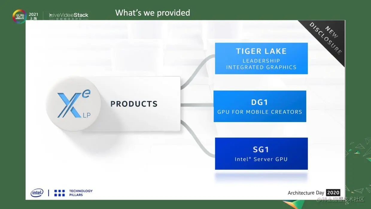 从去年到今年,我们可以看到的Intel硬件可能都是基于Xe的lowPower架构的产品,这个架构有三种平台。一种是Tiger Lake,或者是其续任产品,它就是我们的集成显卡。另外一种是独立显卡DG1,一些笔记本上可能会使用到,他也有单独的显卡。还有一种是SG1,它其实就是4个DG1,是专门给服务器用的,所以可以期待有3~4倍的DG1的性能。