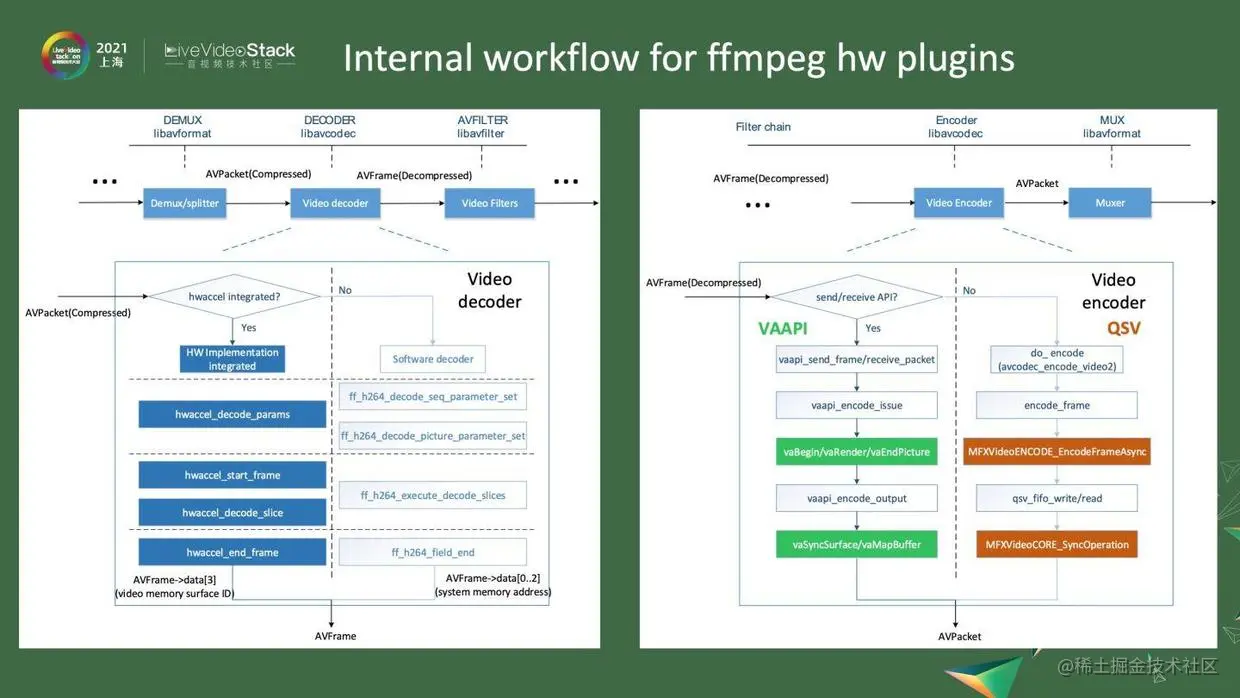 图中展示了一些细节。左边是decode,一般一个码流进来,会经过Demux、video decode、video Fliter等。Decode细化来说,先会接受到AVpacket,其就是一个bitstream,之后会判断有没有硬件decode,如果没有,就会走软件程序流程。软件decode会解码SPS、PPS,将整帧分成不同的slice,然后解码slice,之后就会输出一帧一帧的数据。如果发现有硬件decode,就会走硬件流程。硬件decode就是调用decode_params,把SPS、PPS都送给driver,然后有start_frame告诉driver,它要解码这一帧数据。然后,decode_slice将一个个slice的数据送给driver,送完之后,它就会调用end_frame。end_frame就是告诉driver可以解码了,之后就把数据放到AVFrame的data[3]上。这就是一个Graphic Video memory surface。如果要使用的话,要拿出data[3]。右边是encode,基本上是一个相反的过程。它会接受一个AVFrame,通过encode后,会变换成一个AVpacket数据,就是bitstream数据,会送给Muxer。这里列出了两个接口,一个是VAAPI,一个是QSV。如果调用了VAAPI,就会调用send_frame/receive_packet,之后是encode_issue,它认为参数数据都有了,就会调用vaBeginPicture,它与start_frame是一一对应的,之后就用vaRender把数据都传给driver,再调用EndPicture,就是告诉driver,整帧已经送完。然后调用encode_output,要求做完encode,输出bitstream,并放入AVPacket里面。如果是调用QSV,就简化很多,即调用两个接口即可。一个是EncodeFrameAsync,它是一个异步接口,把帧送给它之后,它在后台编码。或者把当前帧送到FIFO里去,隔几个buffer将帧从FIFO里取出来。之后经过一个SyncOperation,之后就可以拿到bitstream。
